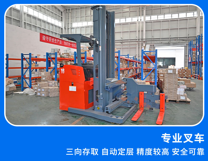 ★利用三向叉車(chē)不需要在貨架通道內(nèi)轉(zhuǎn)彎、叉車(chē)貨叉可以旋轉(zhuǎn)180度存取貨物的特點(diǎn),更好的實(shí)現(xiàn)了倉(cāng)儲(chǔ)空間利用和貨物存取效率的共贏(yíng)