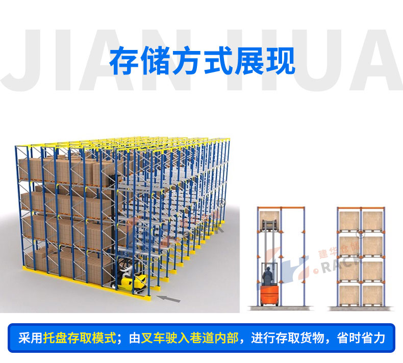 貨物存儲通道亦為叉車儲運(yùn)通道,是存儲密度較高的一種形式貨架。